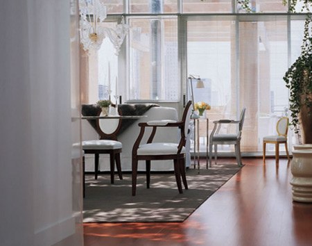 Avec ses murs lambrissés de bois de makoré, ses rideaux blancs vaporeux et ses planchers importés d'Afrique, cet élégant studio vous transporte vers des horizons lointains.  |
