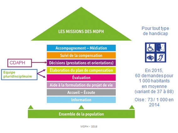 Les missions des MDPH (Pour information, les données de la MDPH de l’Oise, 2016).